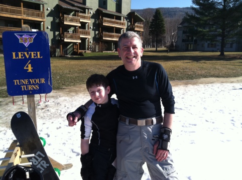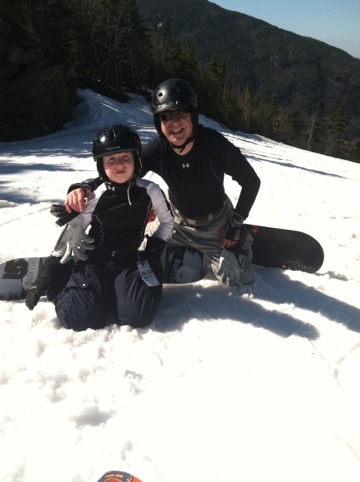 Nice job on the photo Mr. Skier! Off we went and the conditions went for okay to slush pushing to dirt digging. At one point I clipped an edge and ended up doing a nice forward roll in some nice VT muck! It was one of those graceful rolls where I managed to control my hurling mass. One hit to my butt, thank you impact pants, and I was back on the board dirt shoving again.