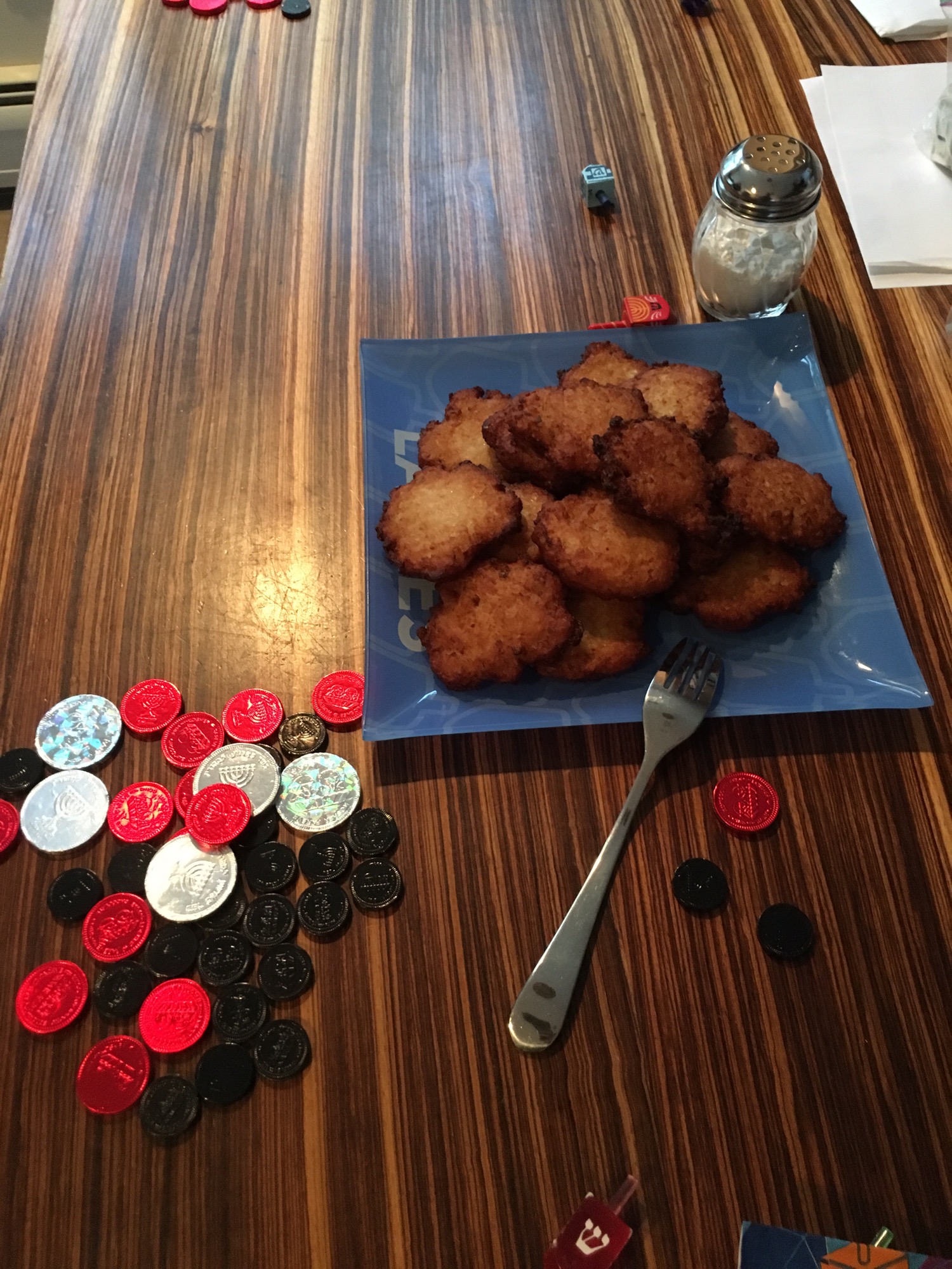 Posted on December 25, 2016 by quinnjalanHappy Hanukkah Hanukkah is not complete without potato latkes, dreidels and gelt. Don’t forget the apple sauce and powdered sugar. We be like eight’s too many, but who’s counting…..menorah that is. Share this: Click to share on Facebook (Opens in new window) Facebook Click to share on X (Opens in new window) X Click to email a link to a friend (Opens in new window) Email Click to print (Opens in new window) Print Like Loading... Related