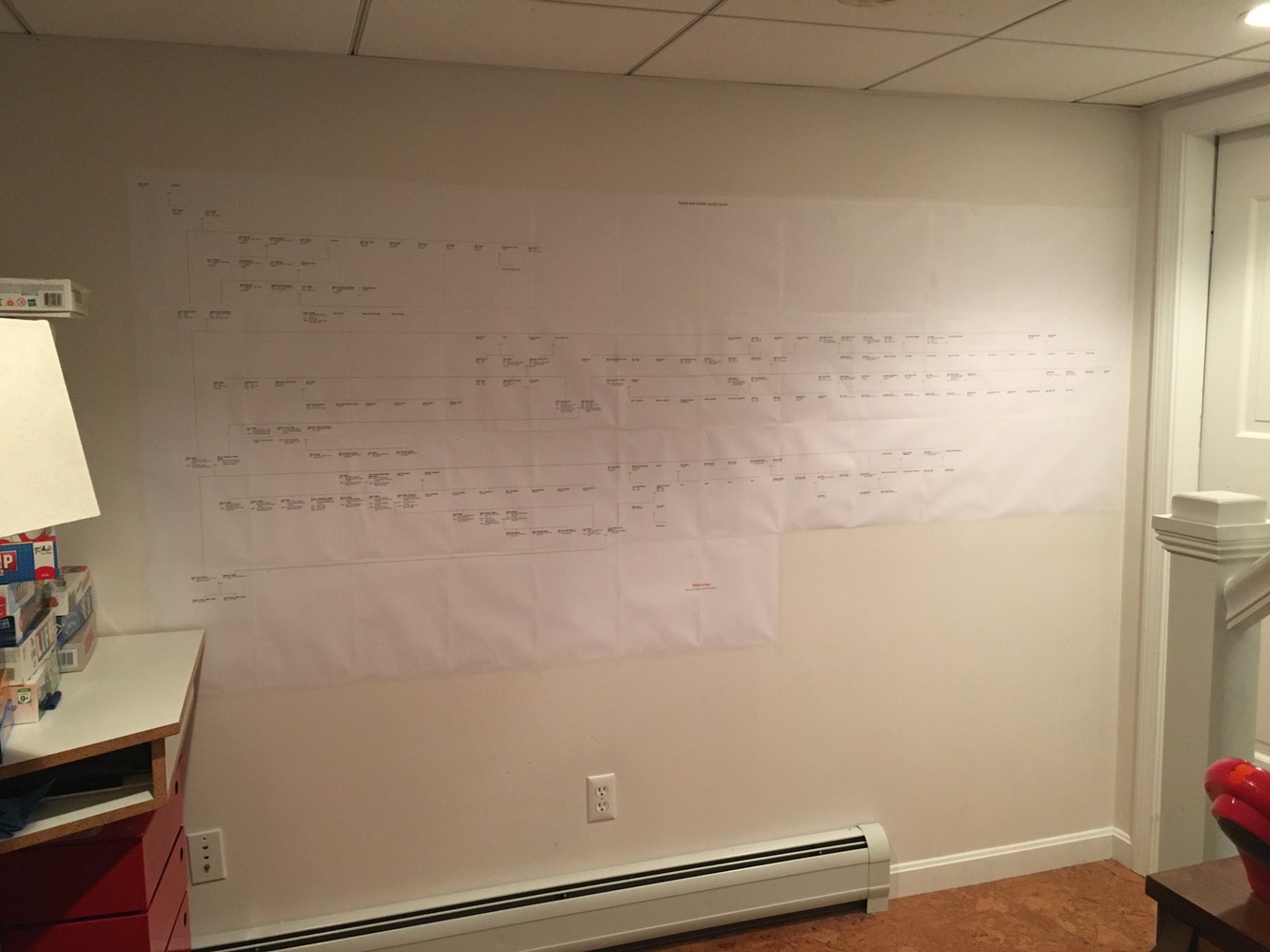 Here’s my evenings work. This is only 3 generations or 194 of 580 in our tree. What you are looking at is 48 8.5×11 sheets or 98″x48″. The whole tree would be 300 8.5×11 sheets and we don’t have a wall big enough to hang it up! Our immediate family starts in the lower left corner.