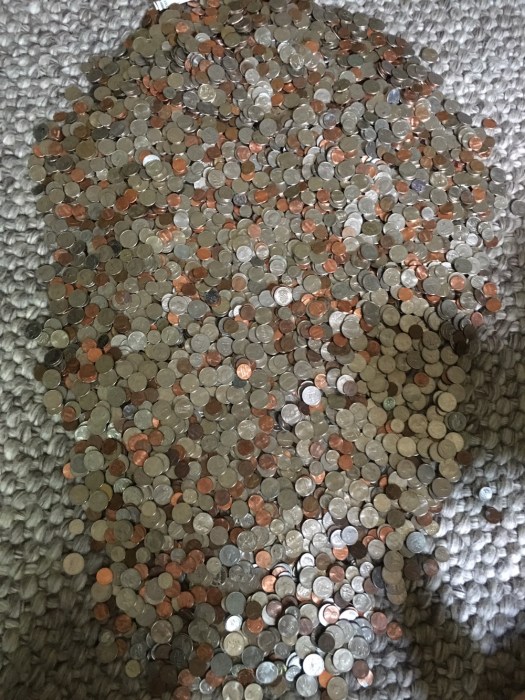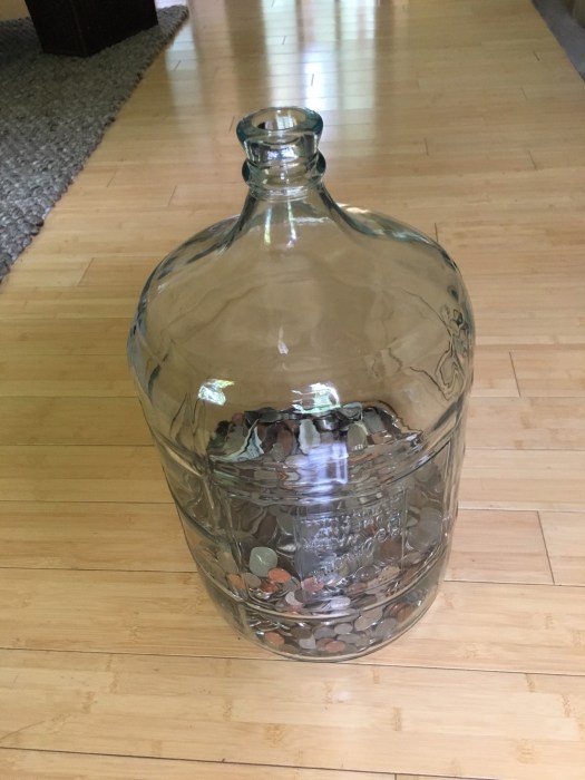 Posted on July 8, 2017 by quinnjalanCounting change Every three years or so we go to bank with our change. We use a gallon glass water fountain bottle to collect it. We all guessed at the amount and no one was even close! 6″ of change equals over $800! Share this: Click to share on Facebook (Opens in new window) Facebook Click to share on X (Opens in new window) X Click to email a link to a friend (Opens in new window) Email Click to print (Opens in new window) Print Like Loading... Related