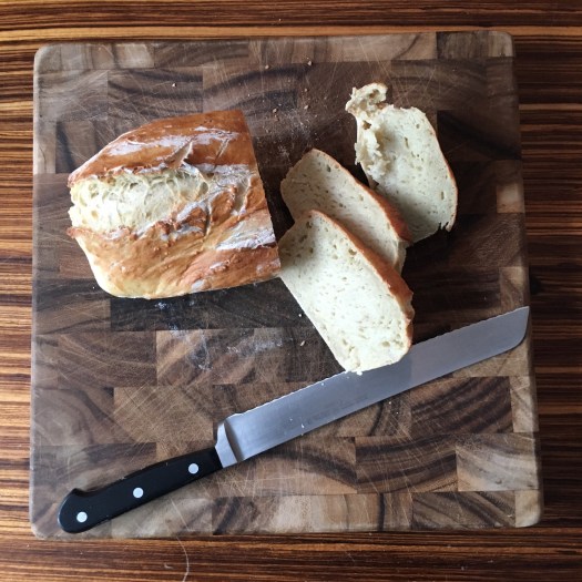 It was a good effort but I think leaving the dough overnight in fridge overnight was it’s downfall….let’s just say it was a bit doughy! However, that didn’t stop us from scarfing it down…something about warm bread!